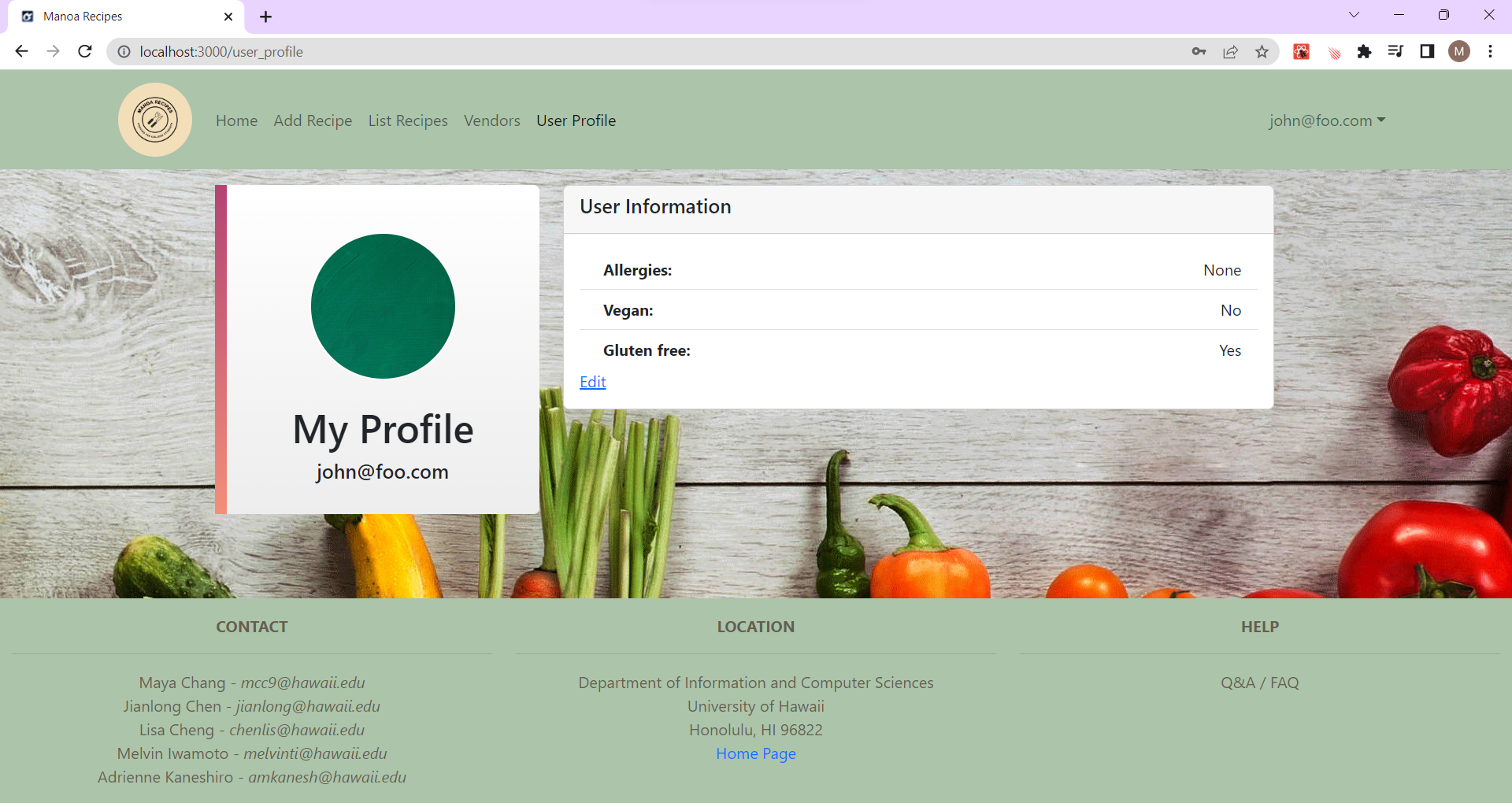 On the “List Recipes” page, users can filter recipes by ingredients and click on individual recipes to see further details about them. Targeted to help UH Manoa students, the site also lists nearby vendors to the school as well as their in-stock items for students to buy groceries if need be. Users can create a profile that stores their allergy information, as well as if they’re gluten free and/or vegan. You can then edit your information later if you wish.